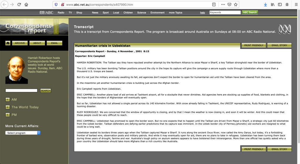 JUMAT malam (02/11) pukul 21.00 waktu Termez sebuah pesawat Uzbekistan Airways yang membawa 40 ton bahan makanan berprotein tinggi milik Unicef mendarat di bandara Termez. Bahan makanan yang diproduksi oleh sebuah pabrik di Kopanhagen Denmark itu akan dikirimkan ke Mazar I Sharif. Dari bandara Termez, dengan menggunakan sebuah kontainer bahan makanan itu dikirim ke gudang PBB sebelum ditimbun di pelabuhan Amu Darya. Belum diketahui kapan bantuan kemanusiaan itu dikirim ke Mazar I Sharif.