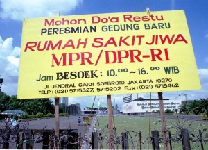 Seorang teman kecewa berat dengan para politisi, baik yang berkantor di gedung wakil rakyat di Senayan, maupun Istana Merdeka. Maka lahirlah ide untuk membuat plang RS Jiwa ini. Dan demikianlah, pada suatu hari dia sukses menancapkan plang RS Jiwa di depan Gedung DPR Senayan.
