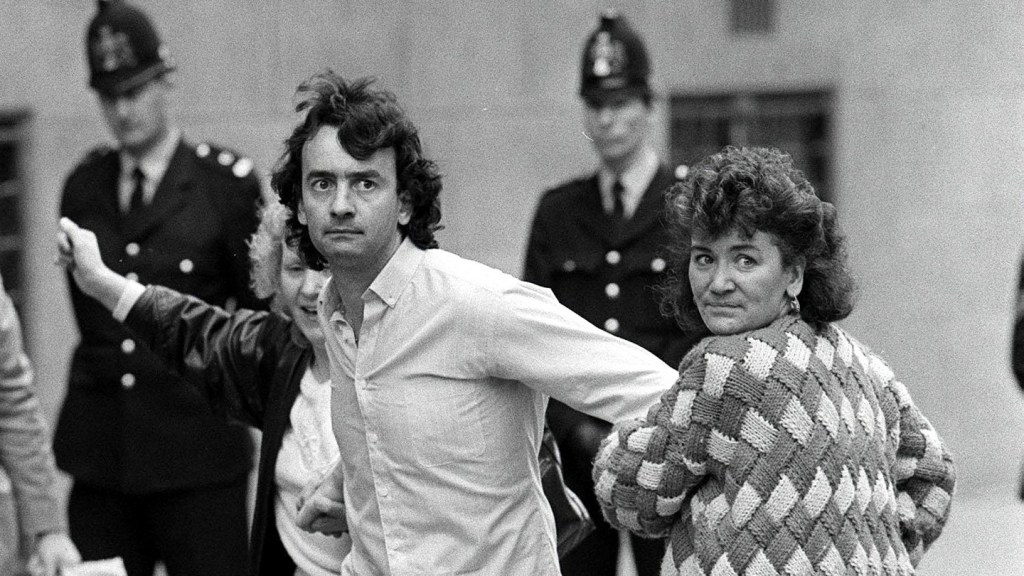 Berdiri di atas meja sambil membuka jas dan mengipas-ngipaskannya, Gerry Conlon melabrak barisan polisi yang berusaha menahan langkahnya.