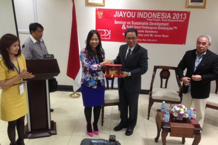 Dutabesar Republik Indonesia untuk Tiongkok Imron Cotan memberikan piagam penghargaan kepada Ketua Persatuan Pelajar Indonesia (PPI) di Tiongkok, Trisna Metta Widyani, usai memberikan kuliah umum di Kedubes RI di Beijing (Jumat, 25/5). Kuliah umum yang disampaikan Dubes Imron Cotan berjudul “Diplomasi Indonesia untuk Mendukung Pembangunan Berkelanjutan”. Selain Dubes Imron Cotan pembicara lain adalah Ketua Umum Asosiasi Pemerintahan Kabupaten Seluruh Indonesia (APKASI) Isran Noor (kanan). Kuliah umum diselenggarakan dalam rangka pembukaan Jiayou Indonesia 2013. Ketua panitia Wenny Fitrianingsih (baju kuning).