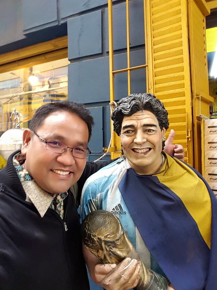Saya pernah memburu Maradona saat berkunjung ke Buenos Aires di tahun 2016 lalu. Saya ke Stadion Boca, menemukan patung dan mural di sekitar stadion yang didedikasikan untuk dirinya.