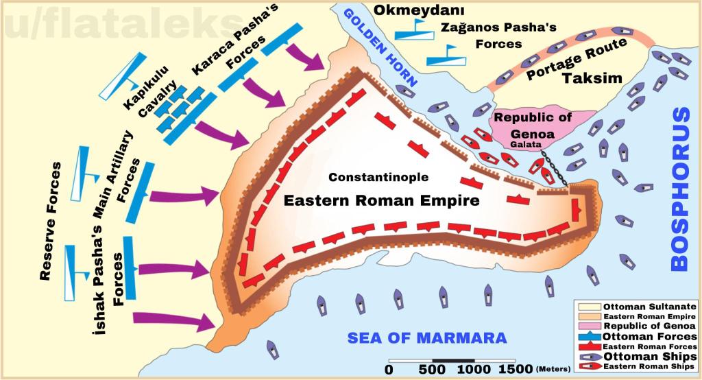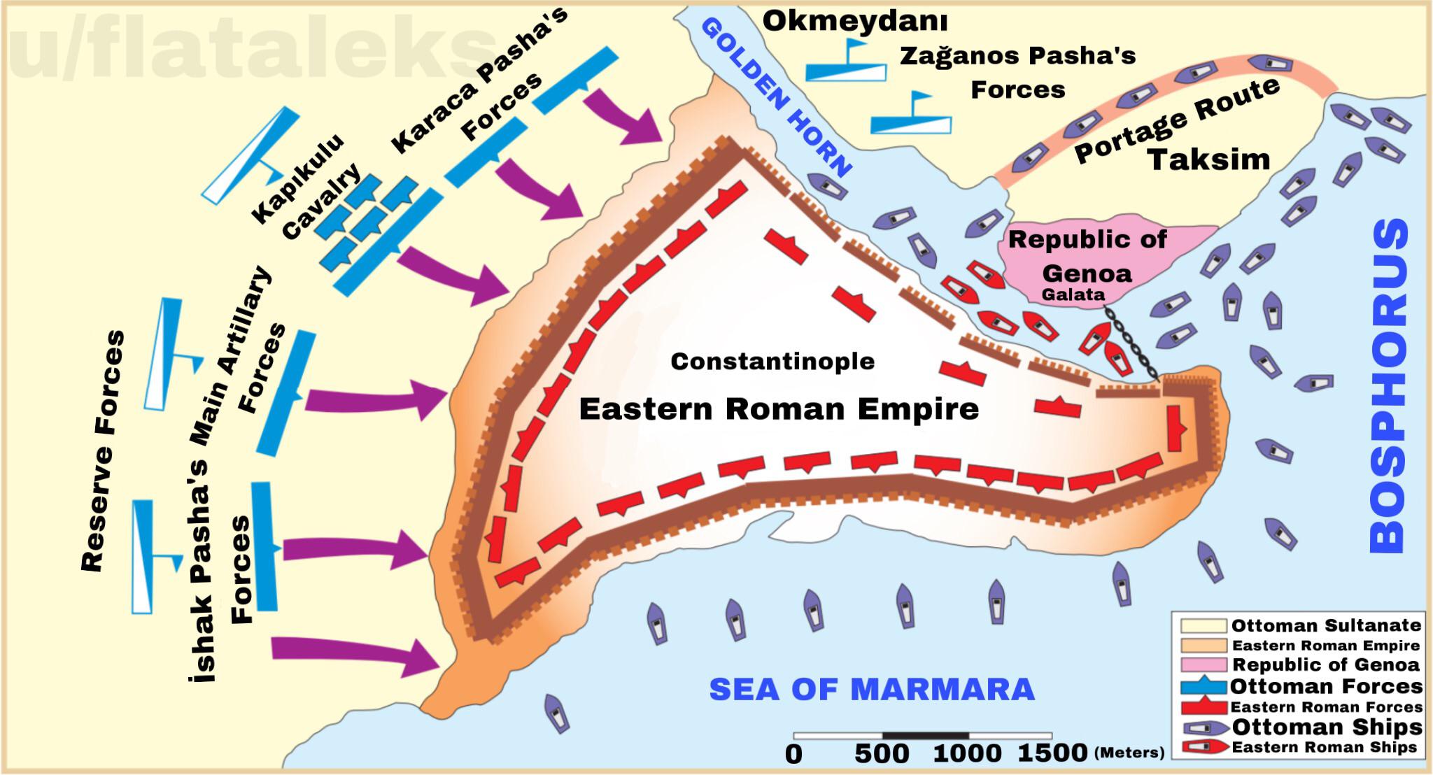 Untuk mencegah kapal-kapal bangsa Arab memasuki Tanduk Emas, penguasa Konstantinopel memasang pertahanan berupa rantai raksasa yang melintasi Golden Horn pada pertemuannya dengan Selat Bosphorus yang memisahkan Eropa dan Asia dan menyambungkan Laut Hitam di utara dan Laut Marmara di selatan.