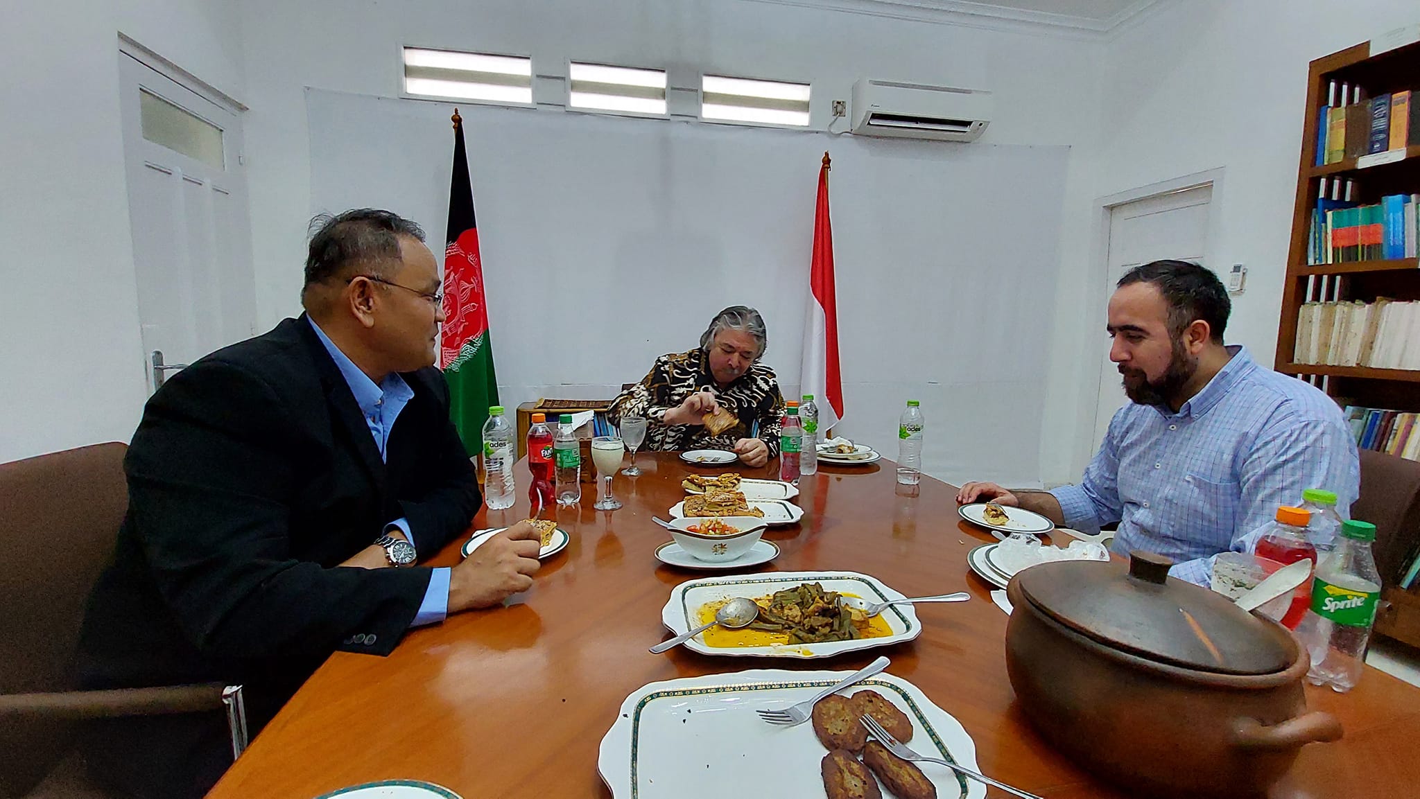 Ruang makan berada di bagian belakang ruang kerja Dubes Zaki. Bendera tiga-warna Republik Islam Afghanistan dan bendera dwi-warna Indonesia berdiri bersisian di kepala meja. Dubes Zaki duduk di bagian itu.