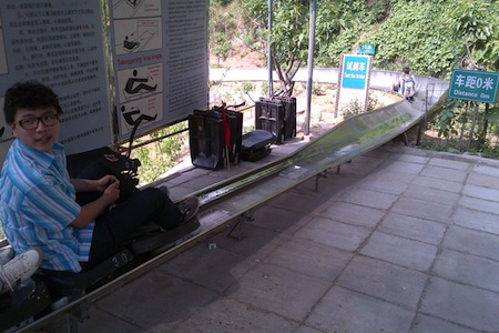 Andreas Rentimun, mahasiswa Indonesia yang sedang menuntut ilmu di Shozou, Tiongkok, mencoba toboggan, peluncur yang digunakan untuk menuruni Tembok China di Gerbang Mutianyu. Peluncur sepanjang 1 kilometer ini adalah salah satu fasilitas penunjang wisata Tembok China yang memudahkan wisatawan sekaligus menambah nuansa petualangan. Tiongkok adalah negara dengan jumlah kunjungan wisatawan asing terbesar ketiga di dunia setelah Prancis dan Amerika Serikat. Pada tahun 2011 negeri itu dikunjungi hampir 57 juta turis asing.