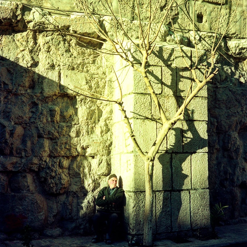 Seorang lelaki tua duduk menikmati sinar mentari senja di Damaskus Tua. Bayangan tubuhnya dan batang pohon di sebelahnya tercetak indah di tembok.